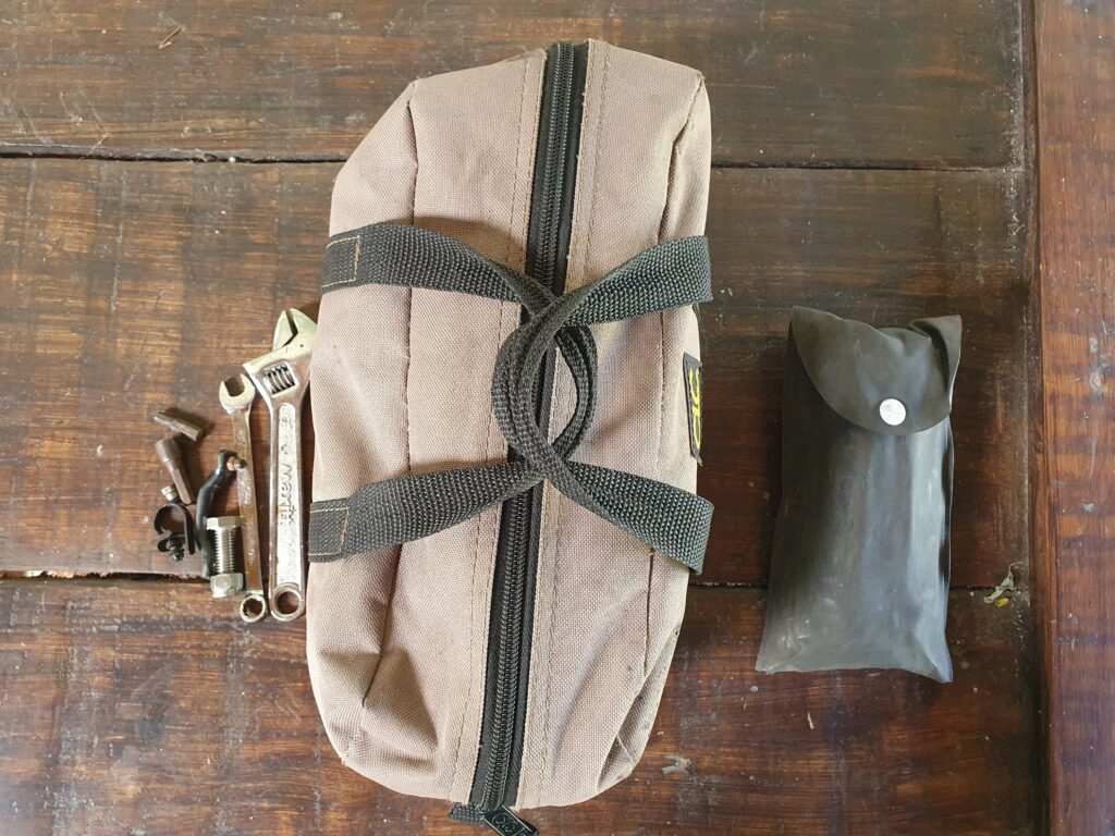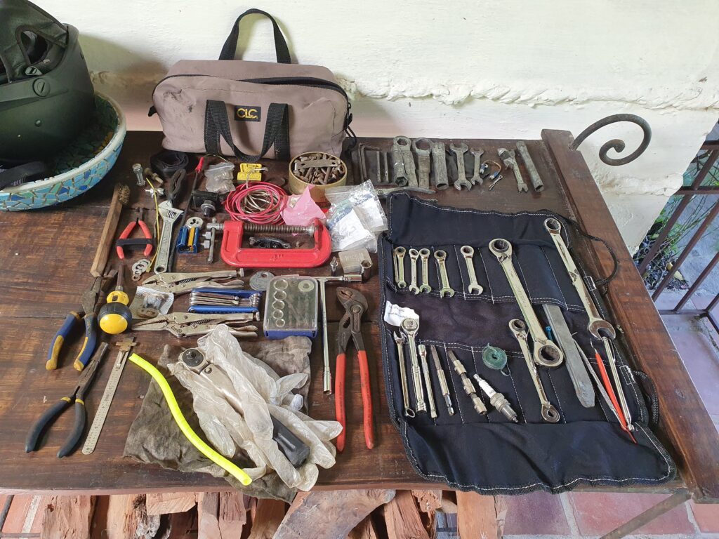 Usé el 90% de lo que llevé. No usé el compresor de aire porque el llantero tenía su propio compresor, pero no viajaría sin compresor. Tal vez sacaría algunos tornillos extras que son de tamaños que tienen muy poco uso. No llevaba el tornillo para reemplazar el tornillo de la montura del freno delantero. Nunca debió soltarse ese tornillo pero me descuidé cuando cambié la llanta delantera antes del viaje y no le puse fijador de rosca a esos tornillos. Casi tengo un accidente y por suerte me di cuenta a tiempo que se me había soltado el freno delantero.
