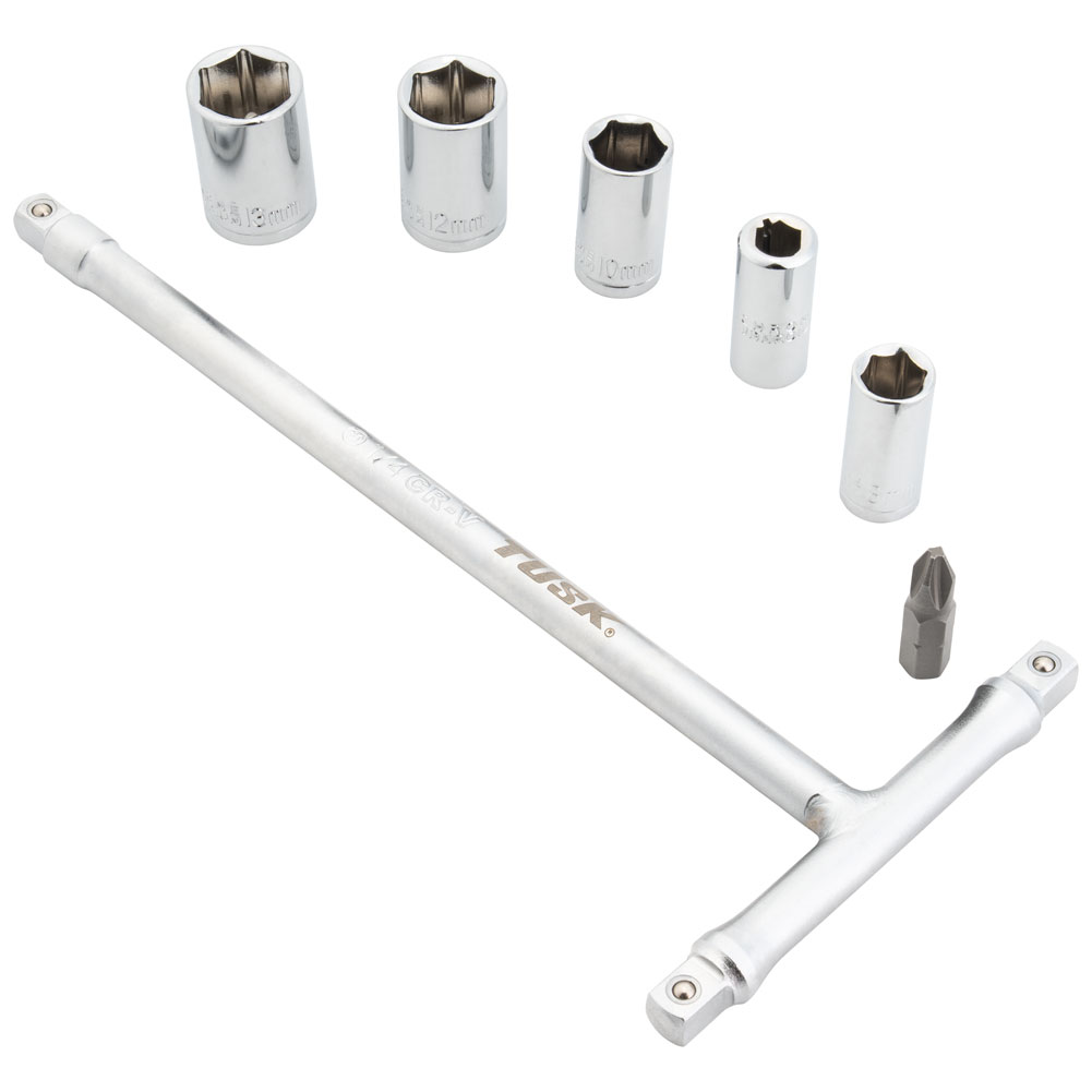 La herramienta que más uso y que siempre cargo cuando voy de viaje es una "T" con dados de 8mm, 10mm y 12mm. Más del 90% de la moto la trabajo con esa sola herramienta.