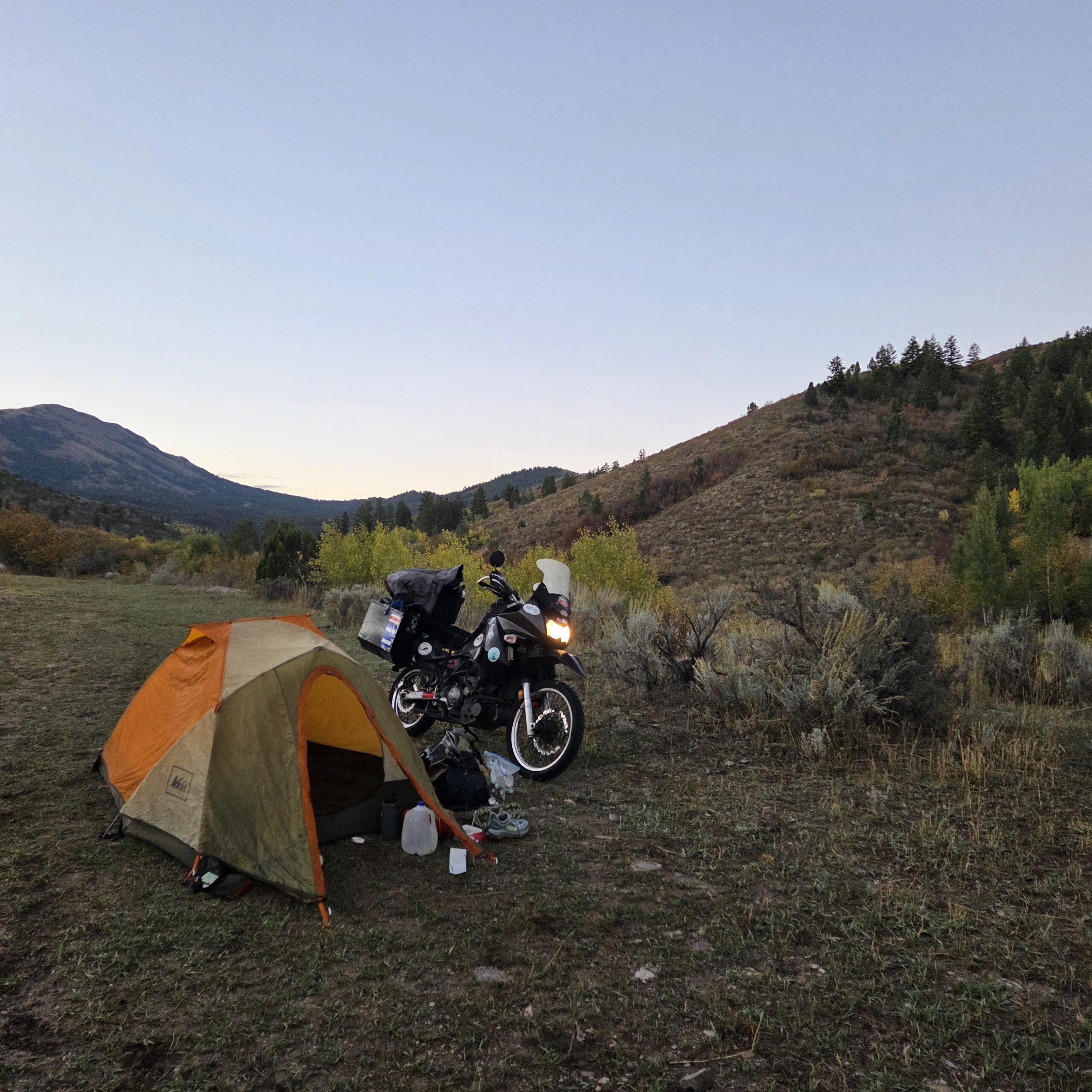 En Utah y Idaho encontré buenos lugares para acampar. Esas noches fueron mis mejores dormidas en todo el viaje. En Utah dormí cerca del Río Colorado dentro de Moab en un campemento que se llama Jaycee. En Idaho dormí en otro parque al lado de Mink Creek. Ahí caí en cuenta que ya estaba muy al norte y las cosas estaban cambiando. Esa noche dormí con toda la ropa que cargaba encima y justo logré dormir cómodo. Y todavía me falta subir más al norte. Dan me prestó más ropa caliente y con esa ropa he podido aguantar mejor el frío. El factor de enfríamiento es bárbaro en la moto. Llego a las gasolineras y todos andan con poca ropa encima y yo estoy arropado hasta la cabeza en ropa caliente.