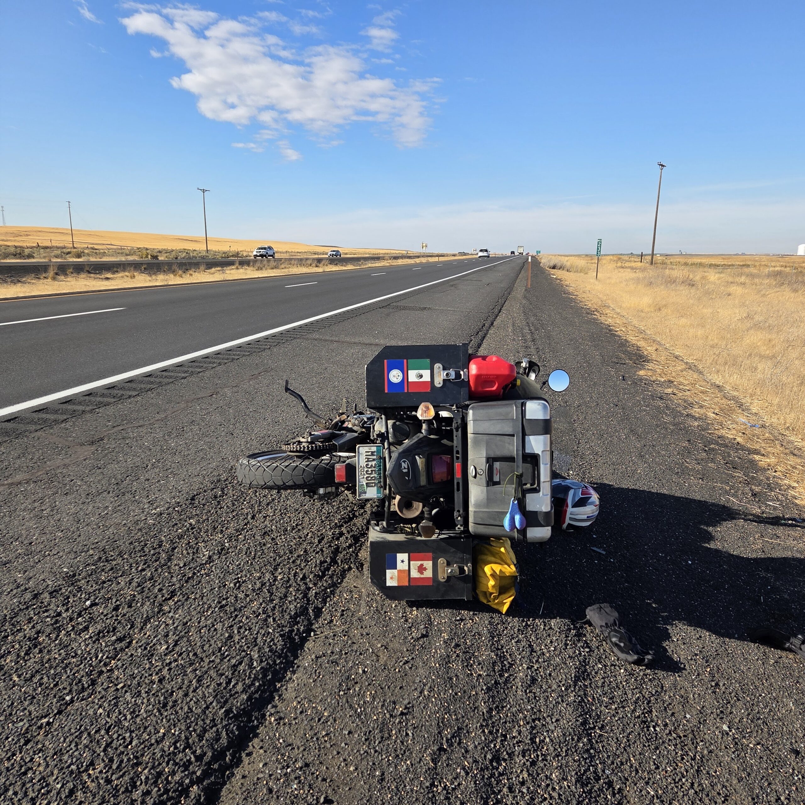 Cuando iba hacia Seattle para luego subir a Vancouver se me acabó el combustible con las gasolineras a la vista. Tenía un galón más en un contenedor. Paré a hacer el relleno y no me fijé que la inclinación del hombro era grande. Apoyé la moto en su pata y me bajé. Mientras estaba al lado de la moto pasó un camión y con su estela de viento me tumbó la moto. Me tocó quitar todo lo que llevaba encima para poder volver a enderezar la moto. Luego que eché el combustible, cuando iba a continuar el viaje escuché un ruido extraño. Me fijé que venía cerca del freno delantero. Cuando me bajé a revisar encontré que había perdido un perno del caliper y el freno delantero estaba por quedar completamente suelto. ¡Qué suerte todo lo que acababa de suceder!