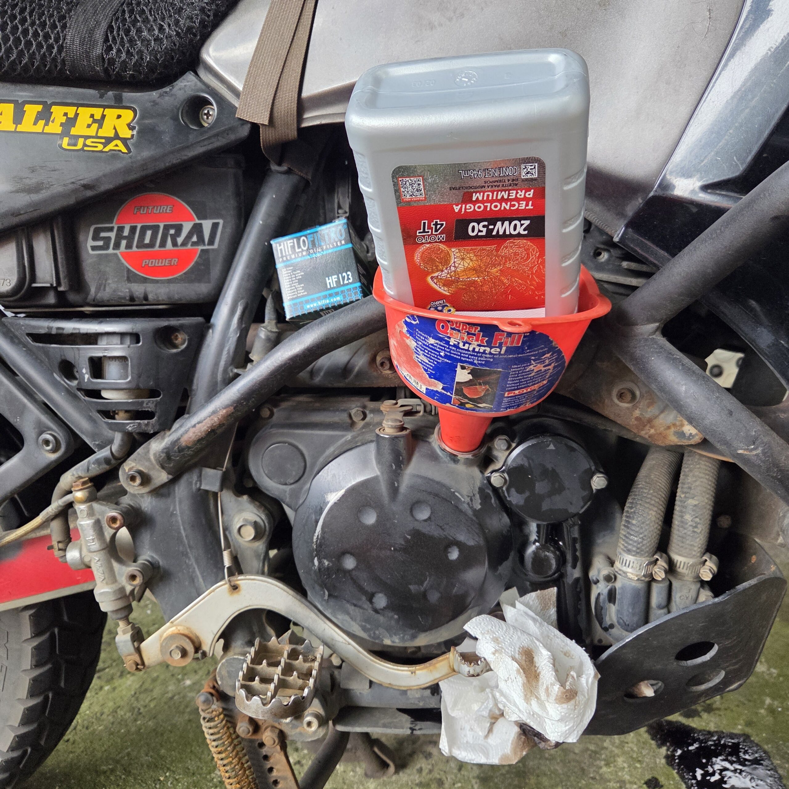 Justo tocaba cambio de aceite así es que también lo hice. Aceite 20W-50 y filtro nuevo para comenzar el viaje con cero kilometros para el aceite. Solo llegar a Canada será 8,000k y el cambio toca cada 10,000k o al año (lo que llegue primero). El filtro de aceite se cambia con cada cambio de aceite. Tengo un filtro de acero inoxidable que se puede limpiar y volver a usar. Me voy a llevar ese filtro para el viaje para no tener que parar a comprar un filtro nuevo durante el recorrido. También cambié el filtro de aire porque el cambio es anual y aprovecho para hacer todo eso a la misma vez.